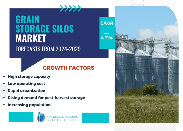 The grain storage silos market is growing as a result of the rising demand for grain silos and storage facilities due to the necessity of effective post-harvest management due to their high capacity and minimal manpower needs, these storages have a cheap operating cost, which is encouraging small farmers to adopt them widely and support grain storage silos industry growth.