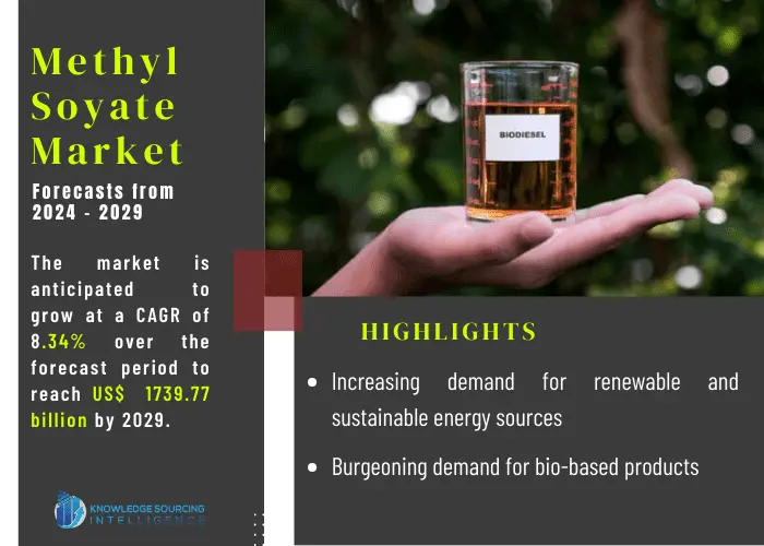The Global Methyl Soyate Market is expected to grow at a CAGR of 8.34% from US$993.054 million in 2022 to US$1,739.77 million in 2029.