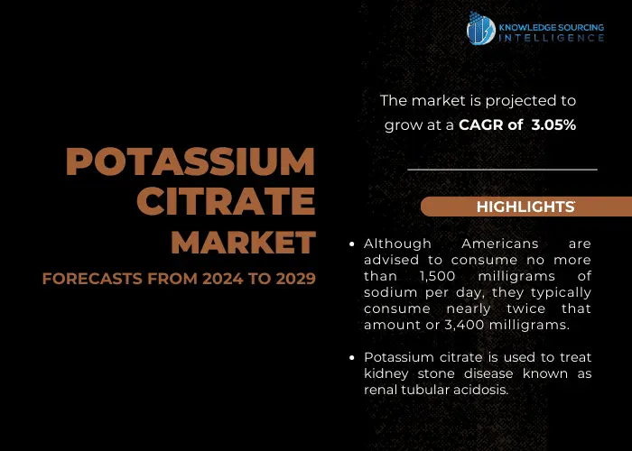 Potassium citrate market growth is anticipated to be driven by the growing demand for processed foods and the consequent expansion of the processed food industry. Growth in the population, rising urbanization and industrialization, and rising consumer demand for non-GMO potassium citrate products are anticipated to propel market expansion. In addition, potassium citrate's remarkable qualities—such as its high water solubility, remarkable biodegradability, and high chemical and microbiological stability—fuel demand for the product on a worldwide scale.